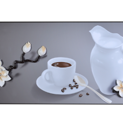 Hình ảnh của một tách cà phê sữa sánh đặc, tạo cảm giác tươi tỉnh cùng gam màu trắng tinh khiết của gốm sứ. Điểm xuyến bên cạnh đó là những bông hoa Mộc lan mang lại sự ngọt ngào, dễ chịu, thanh khiết và trong sáng, là loài hoa đại diện cho mùa xuân, cho cuộc sống mới, khởi đầu mới.